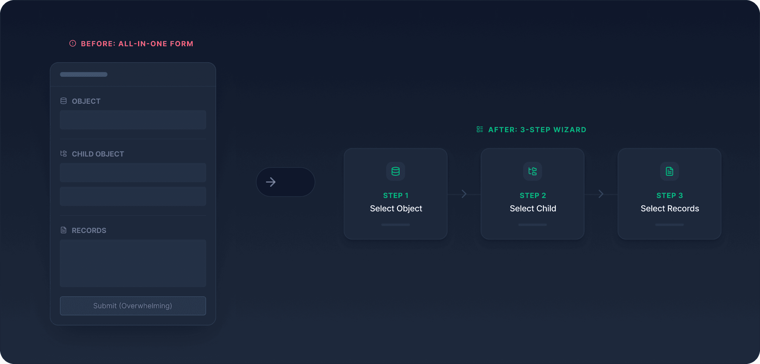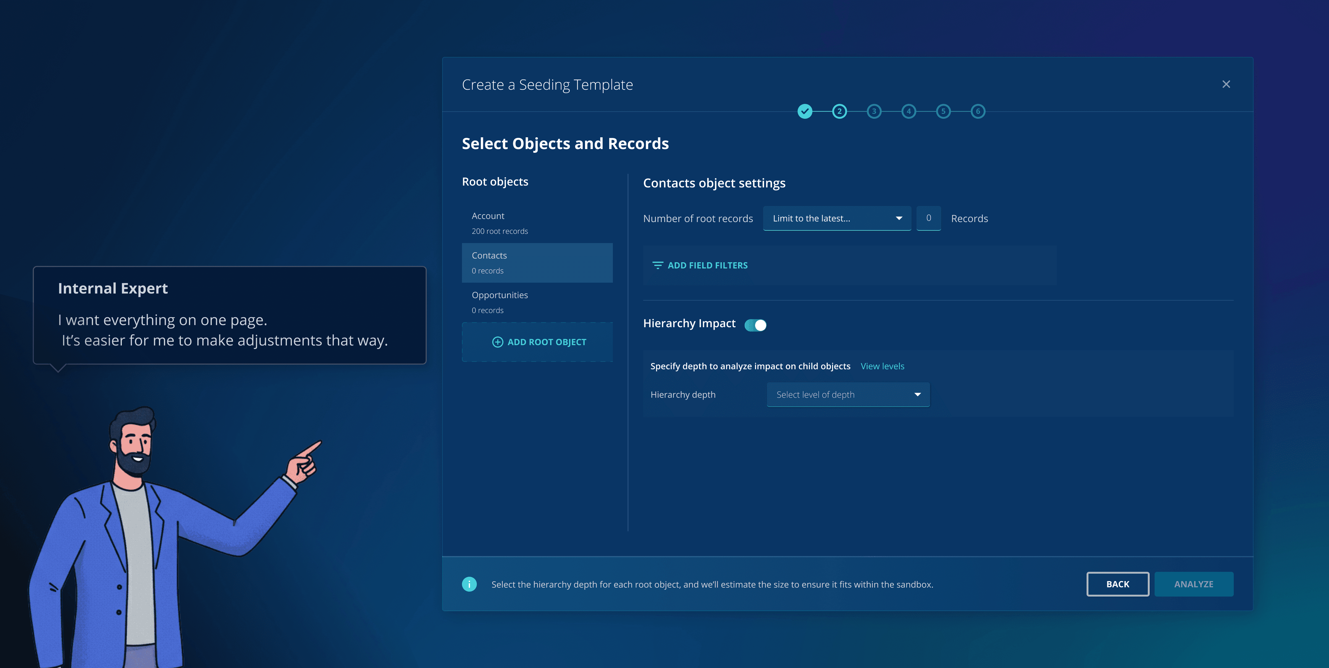I designed a relationship model that reveals how objects connect across parent-child hierarchies and cross-object references. This allowed users to understand the structural impact of selecting or excluding specific objects before seeding data.
