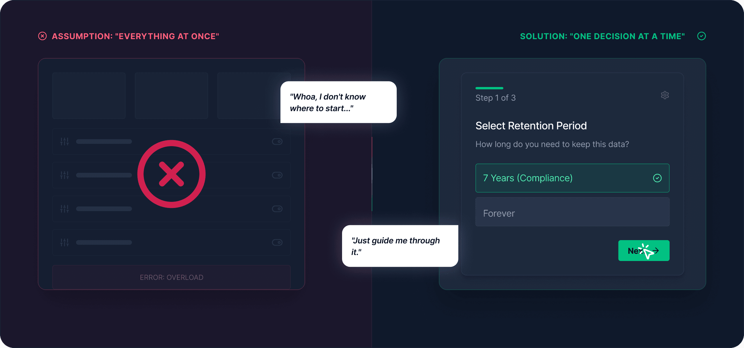 The turning point came when we finally spoke with real target users. After just two interviews, the gap became obvious. These users weren’t super-users. They didn’t want full control upfront. They wanted help deciding, step by step. What they were asking for wasn’t less complexity—it was structured complexity. That moment made the risk clear: the problem wasn’t the system’s sophistication, but how we were asking humans to process it.